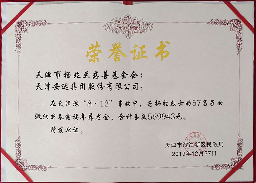 2015年天津市楊兆蘭慈善基金會(huì )、天津安達集團捐款,為在天津港“8.12”事故中,不幸犧牲烈士的57名子女通過(guò)人保繳納國泰鑫福年養老金,合計57萬(wàn)余元。對于安達集團崔洪金董事長(cháng)的這份暖心善舉,濱海新區慈善協(xié)會(huì )會(huì )長(cháng)張傳捷攜濱海新區民政局相關(guān)領(lǐng)導親自登門(mén)感謝,將這份沉甸甸的獎狀送到崔洪金手里,以示表?yè)P和鼓勵。