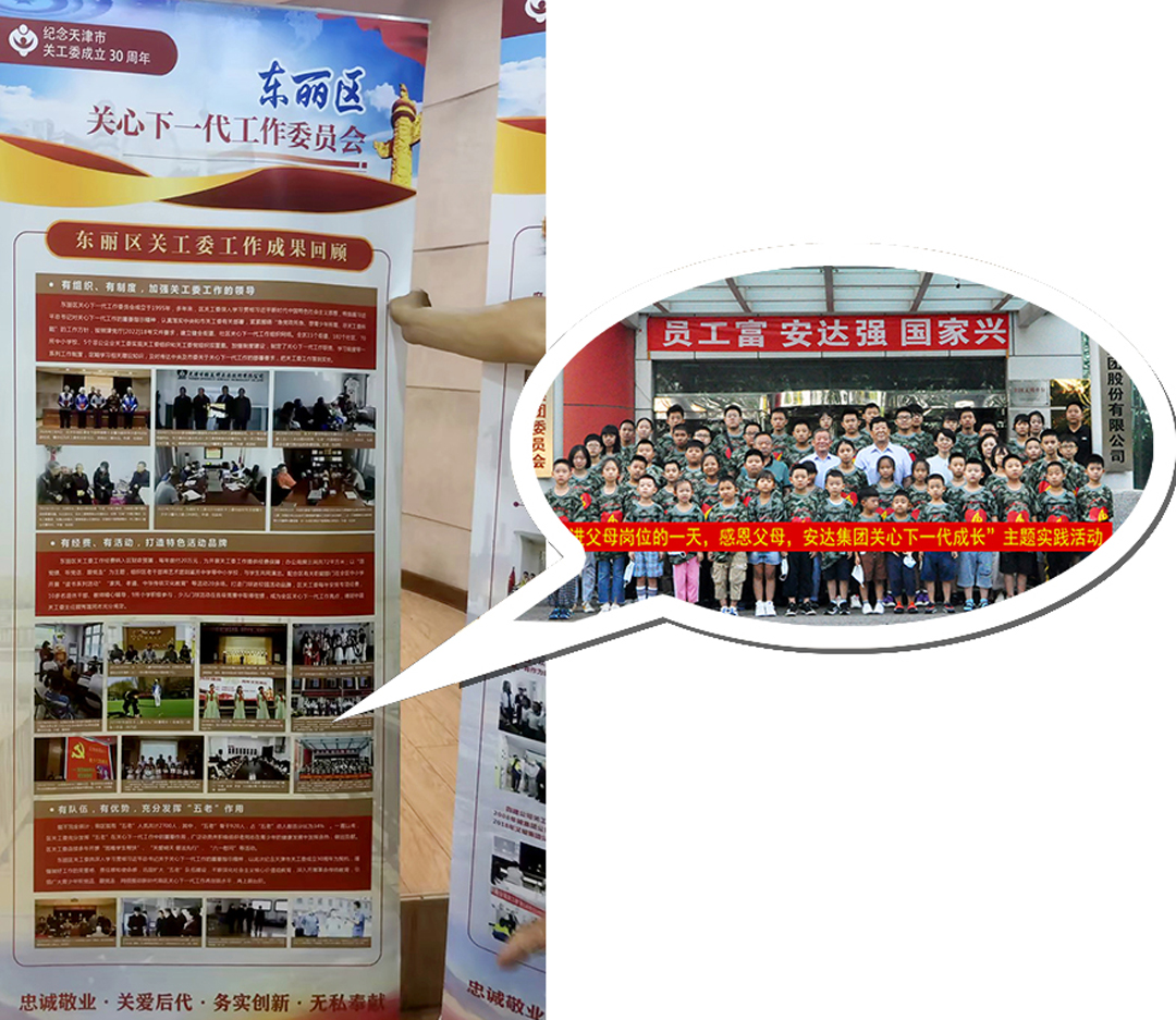 按照市關(guān)工委工作安排,為深入學(xué)習貫徹習近平總書(shū)記關(guān)于關(guān)心下一代工作重要指示和視察天津重要講話(huà)精神,更好展示基層工作成果,進(jìn)一步發(fā)揮各級關(guān)工委和廣大“五老”在教育引導和關(guān)愛(ài)保護青少年工作中的積極作用,推動(dòng)關(guān)心下一代事業(yè)高質(zhì)量發(fā)展,區關(guān)工委組織開(kāi)展《天津市關(guān)工委成立30周年紀念成果展》觀(guān)展活動(dòng)。安達集團黨委書(shū)記、董事長(cháng)崔洪金作為區關(guān)工委委員受邀參加觀(guān)展。老干部局局長(cháng)、關(guān)工委委員郝寶杰,老干部局副局長(cháng)、關(guān)工委委員柴恭慶全程陪同接待。安達集團“走進(jìn)父母崗位的一天,感恩父母,關(guān)心下一代成長(cháng)”主題活動(dòng)被選為東麗區優(yōu)秀案例參加巡展。豐富多彩的活動(dòng),充分展現了各級關(guān)工委對下一代工作的高度重視和積極踐行。崔洪金董事長(cháng)同樣表示:未來(lái)安達集團關(guān)工委將積極履行社會(huì )責任,持續為關(guān)心下一代事業(yè)發(fā)展不懈努力。